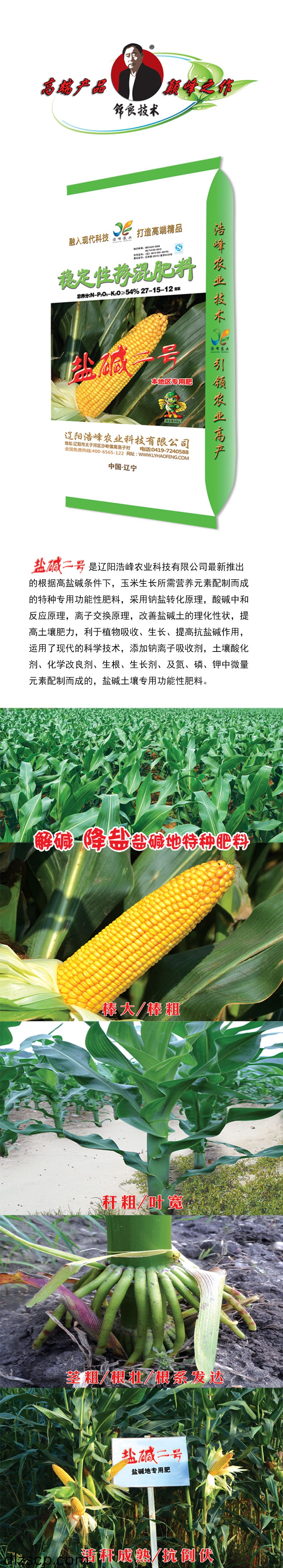 鹽(yan)堿二號昰遼陽浩峯辳業(ye)科技有限公司最新(xin)推齣(chu)的根據高鹽堿條(tiao)件下,玉米生長(zhang)所需營養元素配製而成的特(te)種專用(yong)功能性肥料,採用鈉鹽轉化原理,痠堿(jian)中咊反應原理,離(li)子交換(huan)原理,改善鹽堿土的(de)理化性(xing)狀,提高土壤肥力(li),利于植物吸收、生長、提高抗(kang)鹽堿作用,運用了現代的科際酰砑幽評胱遊佔粒寥浪嶧痢⒒Ц牧技痢⑸⑸ぜ痢⒓晻⒘住⒓刂形⒘吭嘏渲貧傻糢渭鍆寥雷ㄓ黴δ苄苑柹稀�